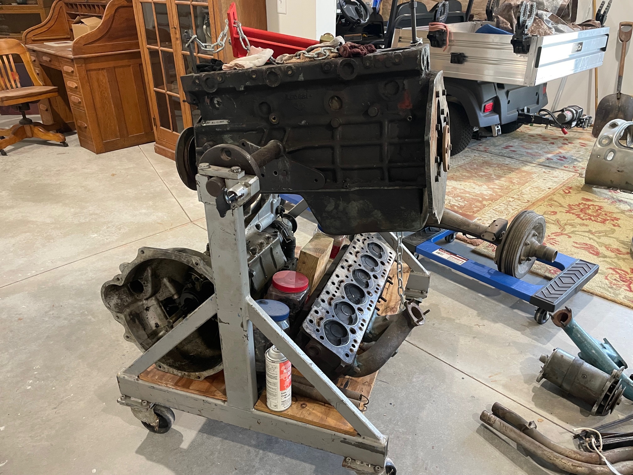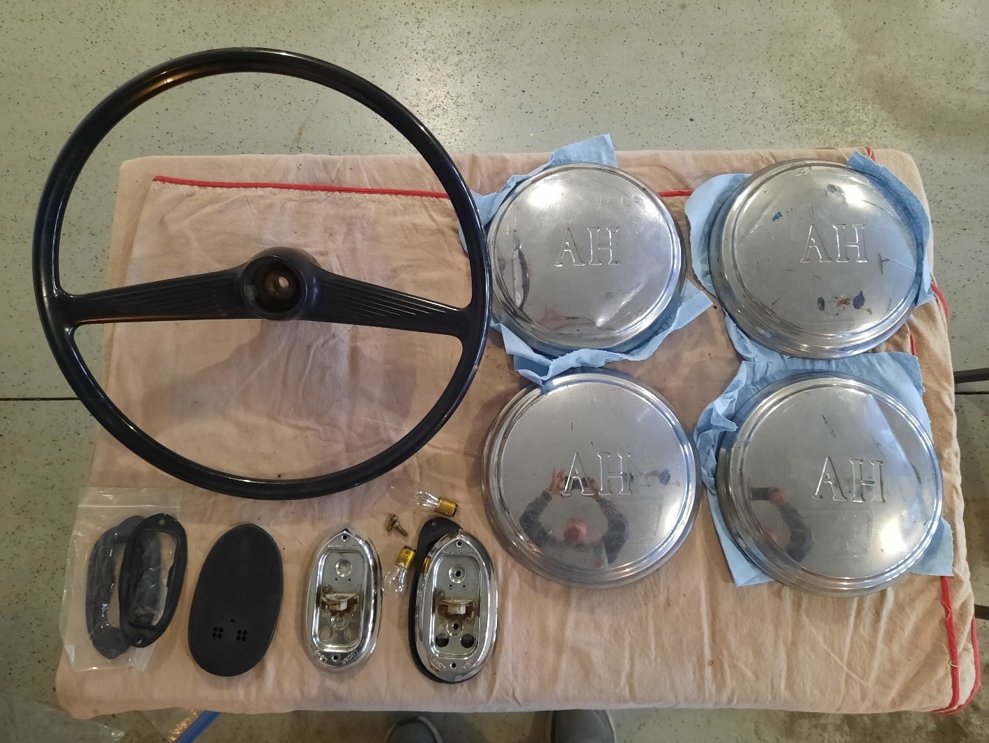 Numerous Lucas lenses, 1 Steering wheel, 1 Tachometer, nut and bolts etc.